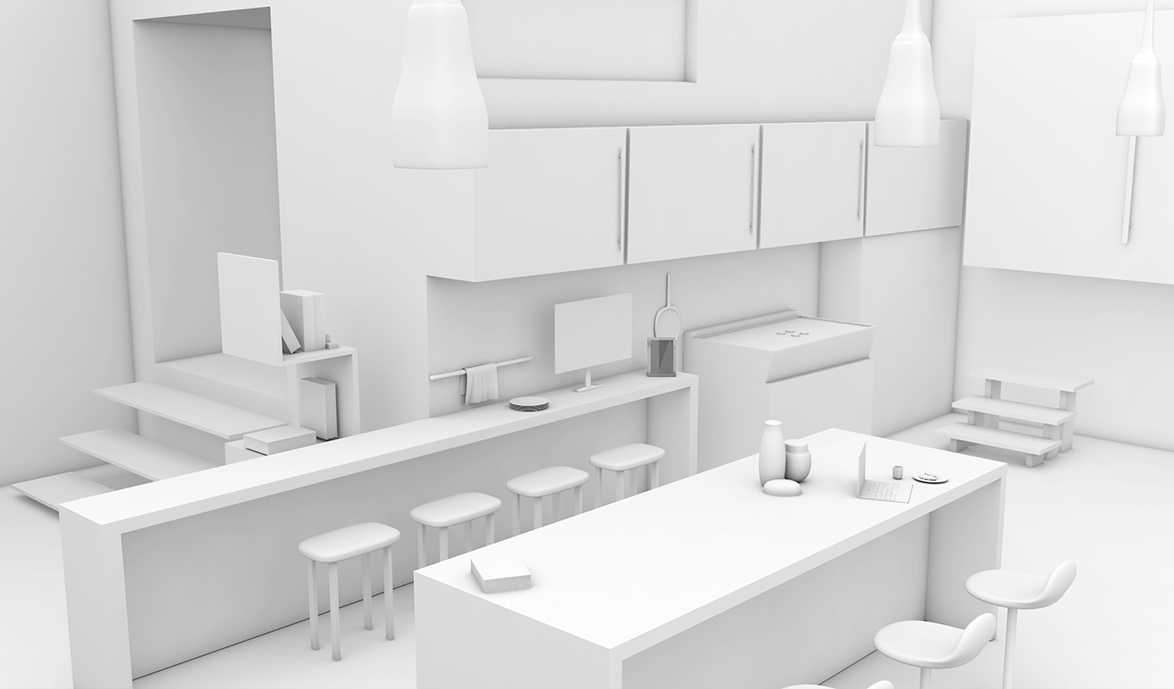 This modern style kitchen was designed as a proof of concept. Made in Cinema 4D, Every assets and model was created without templates or ready-made objects.