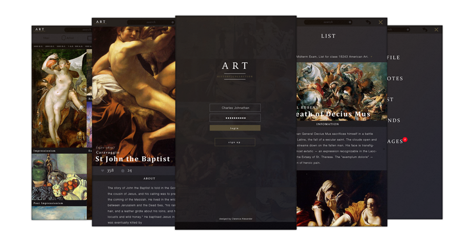 Art History Collection app is design around mulitple art related artifacts and an array of books, articles, and lectures. The use of a dark and flat design help sets an erie, atmospheric theme that enhances the look and feel of the art work.