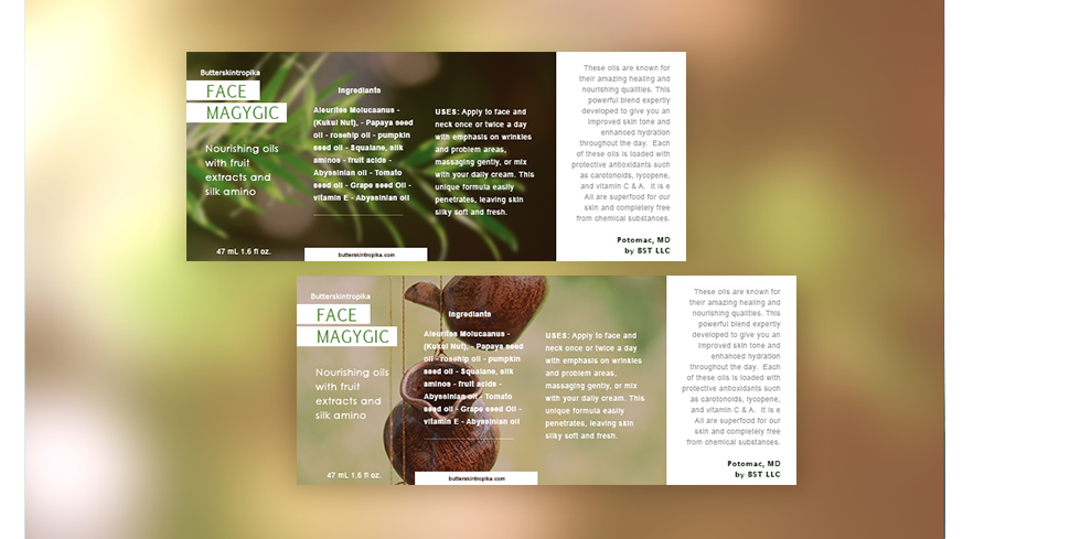 Designing labels for various products has many limitation based on the size of the product. Using colors and images from the Butterskin Tropika brand. This box design is 3.25in x 7.75in and is used to incapsulate the Oil's bottle.