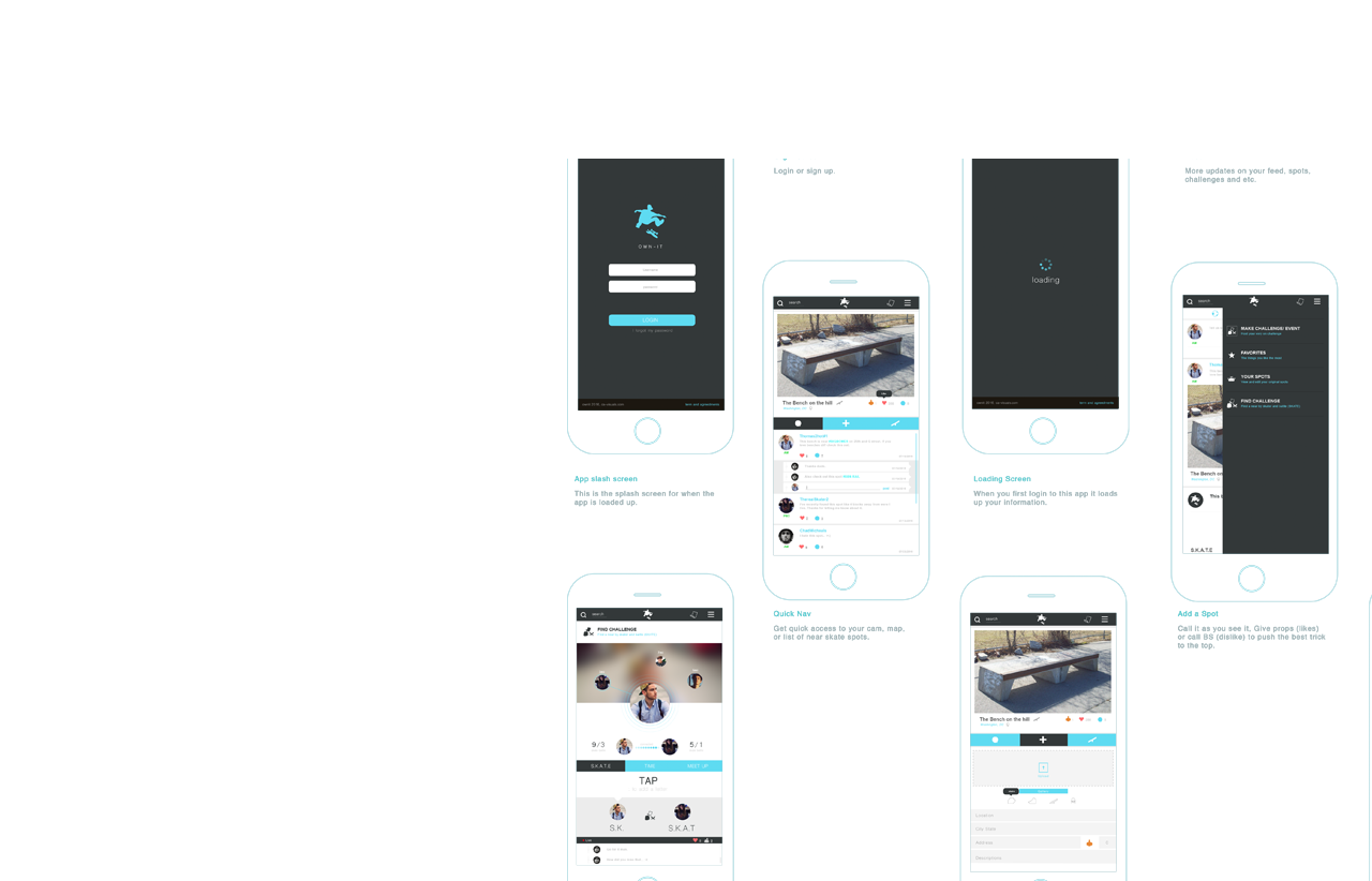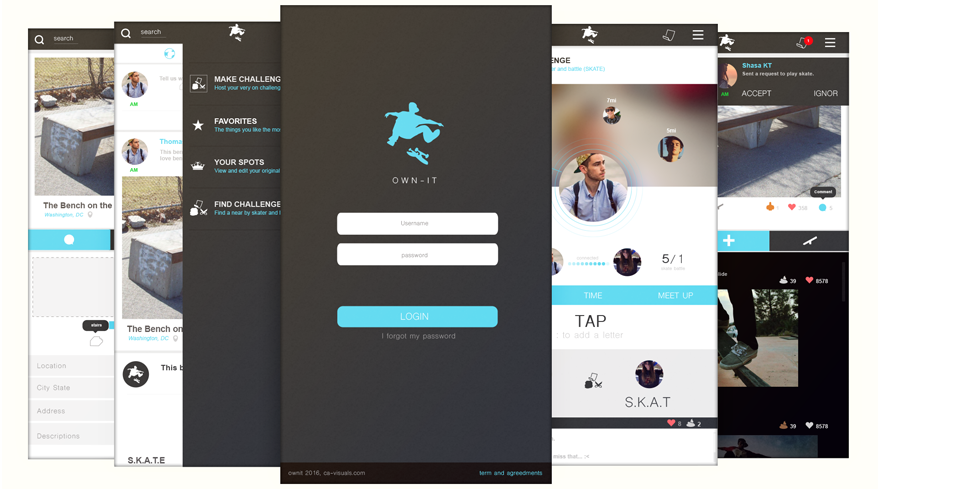 OWN-IT is a skate app thats design for skaters to share spot, tricks, photos, and video to prove themselves in the skate world. Using social media, this app gives skater around the world idea’s and insight to new skate spots.