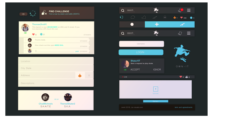 Own - It design core design centers around two main concepts, Exploring the skate world and making making a mark for all to see. The design is tailored to profiles and uploads to help expand and grow the global skate world.